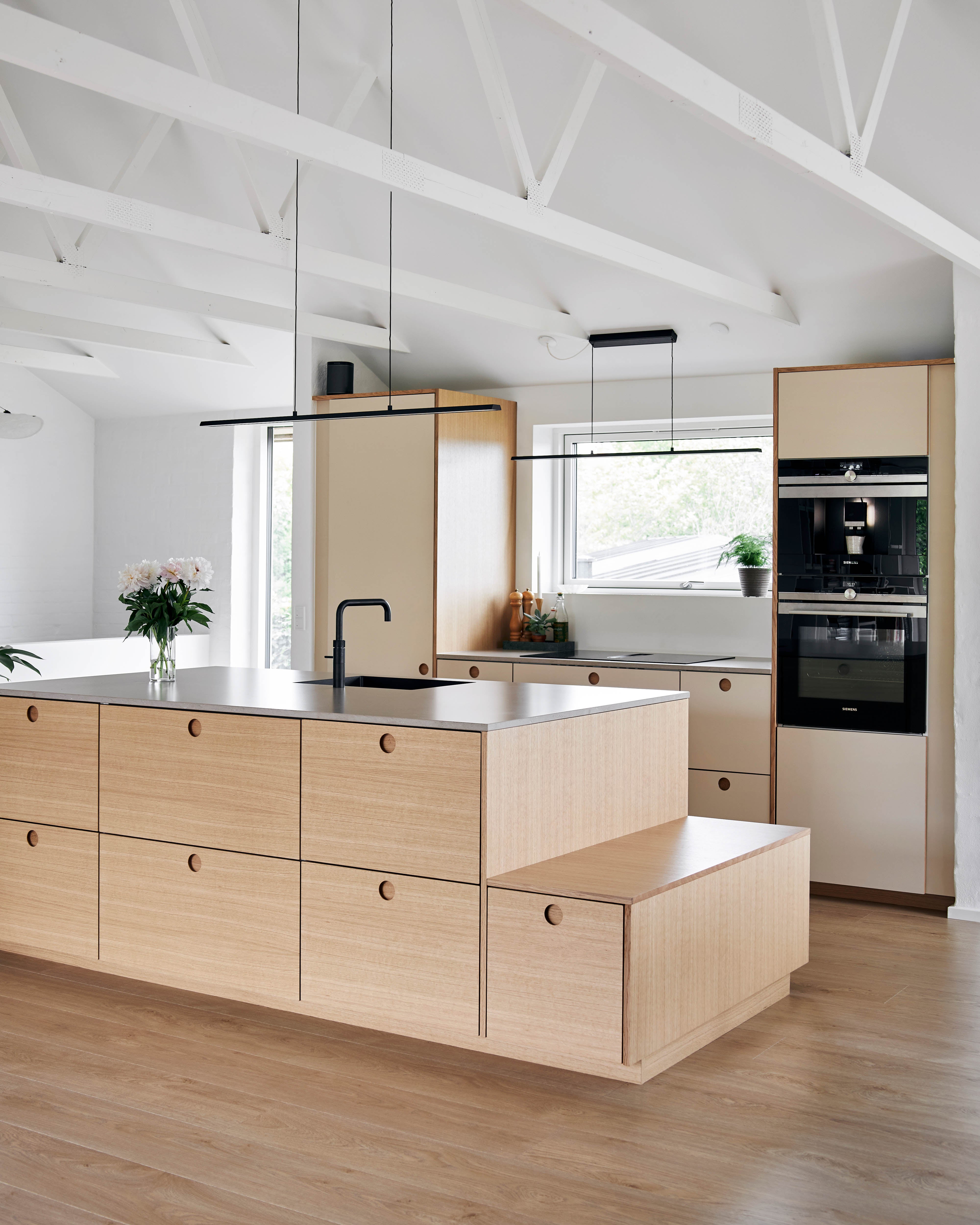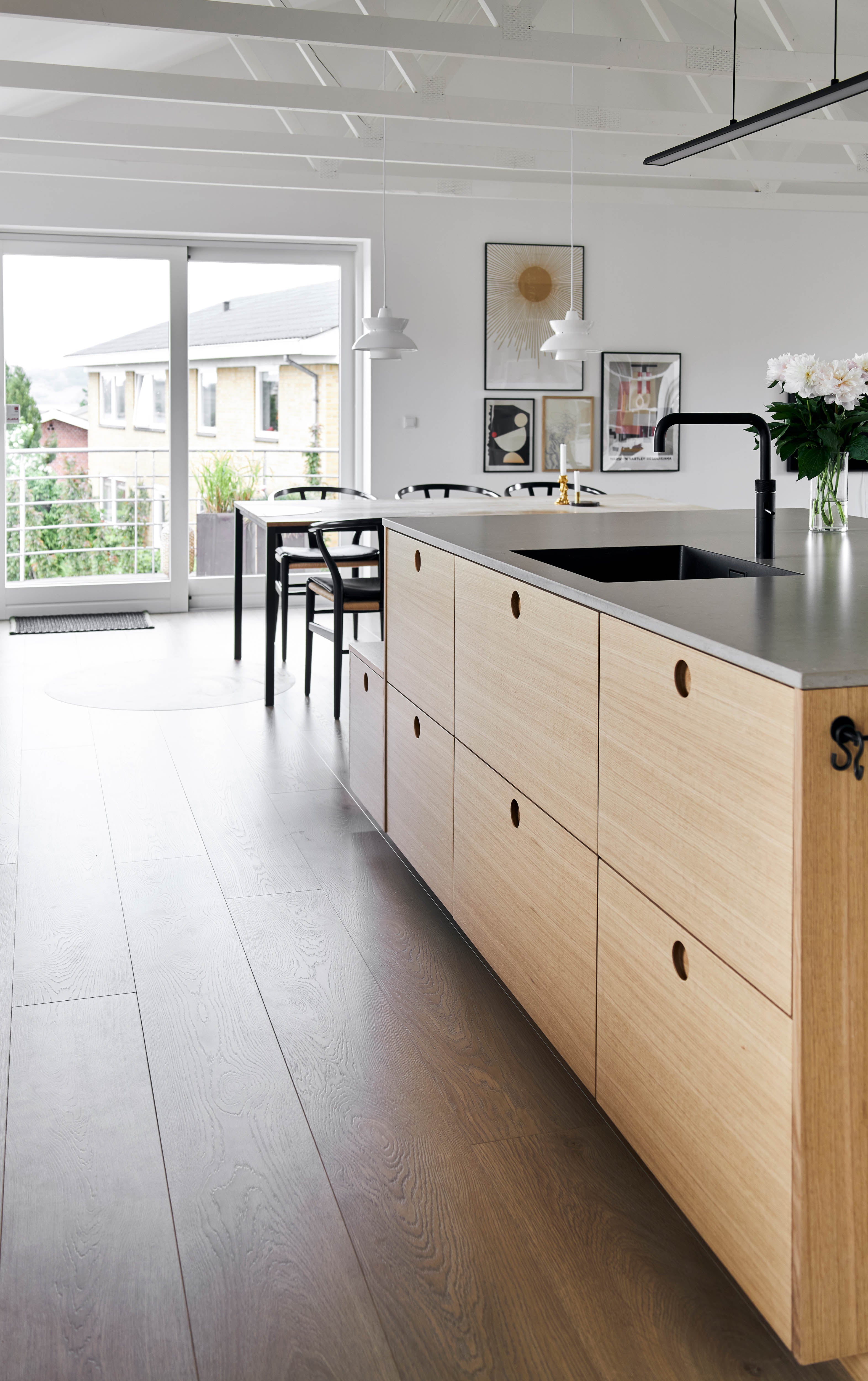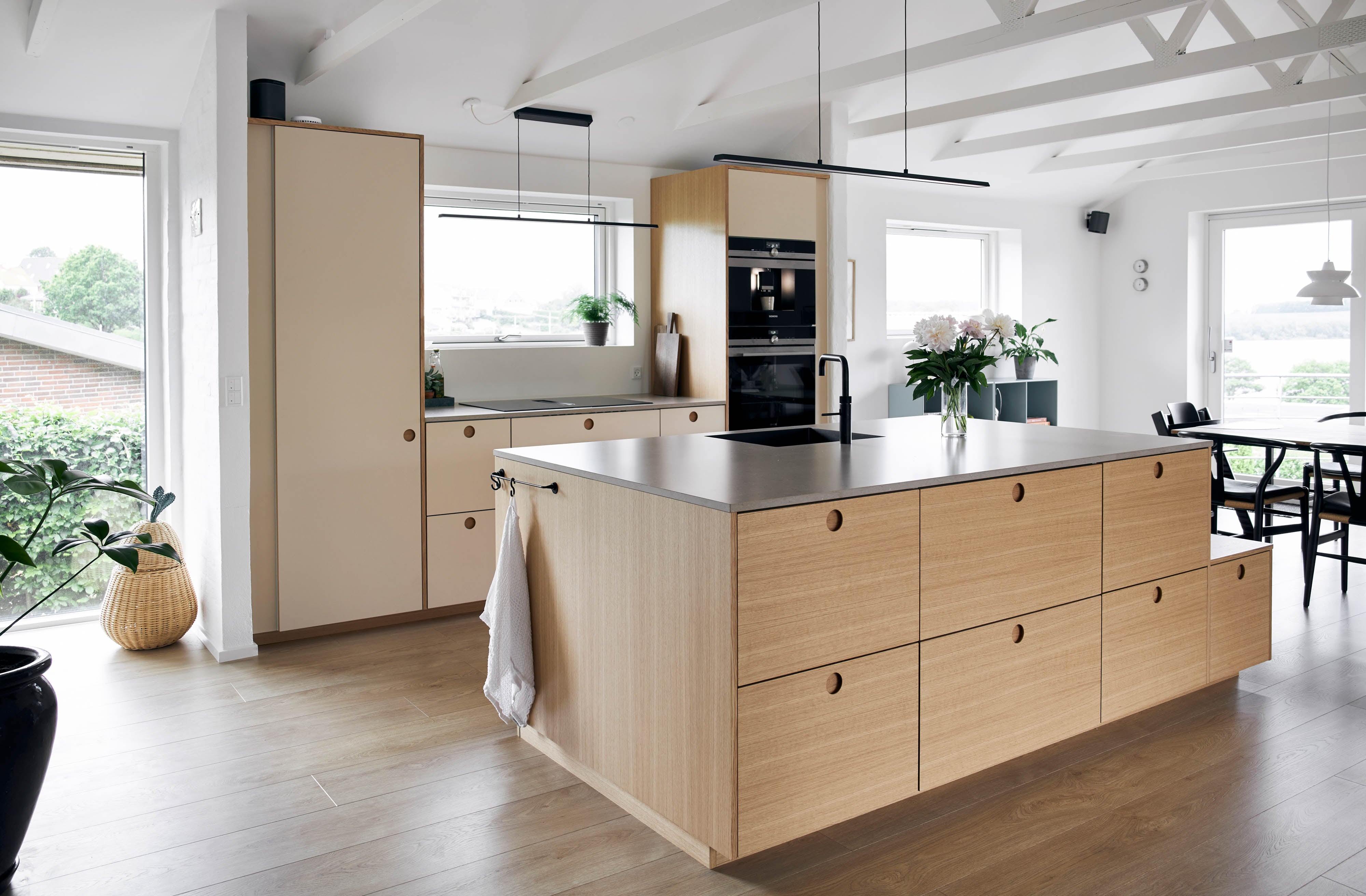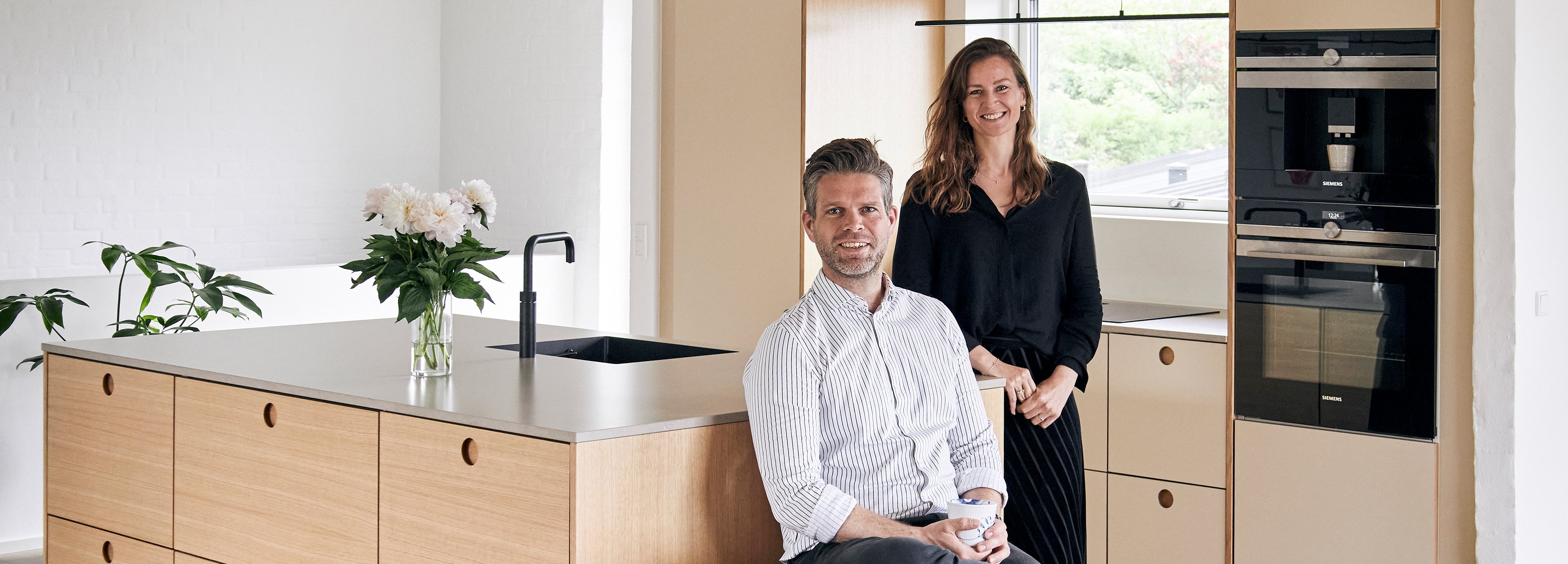 Maja og Jeppe ønskede et køkken i egetræ, men uden at det virkede for traditionelt. Derfor valgte de en kombination af egetræs- og laminatfronter. Efter en omhyggelig overvejelse fandt de den ideelle farve, som ville passe perfekt til deres hjem og stil, både nu og i fremtiden.