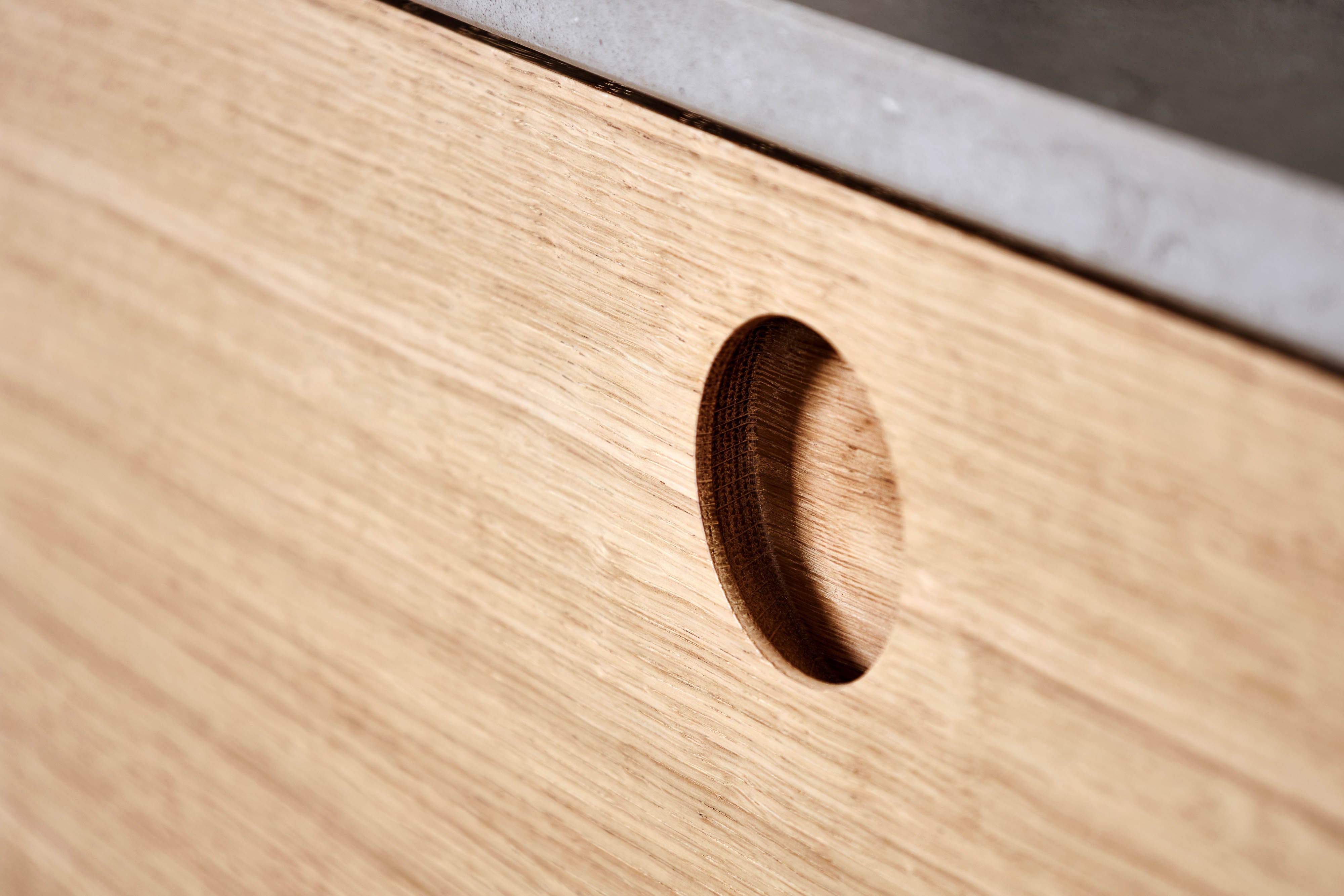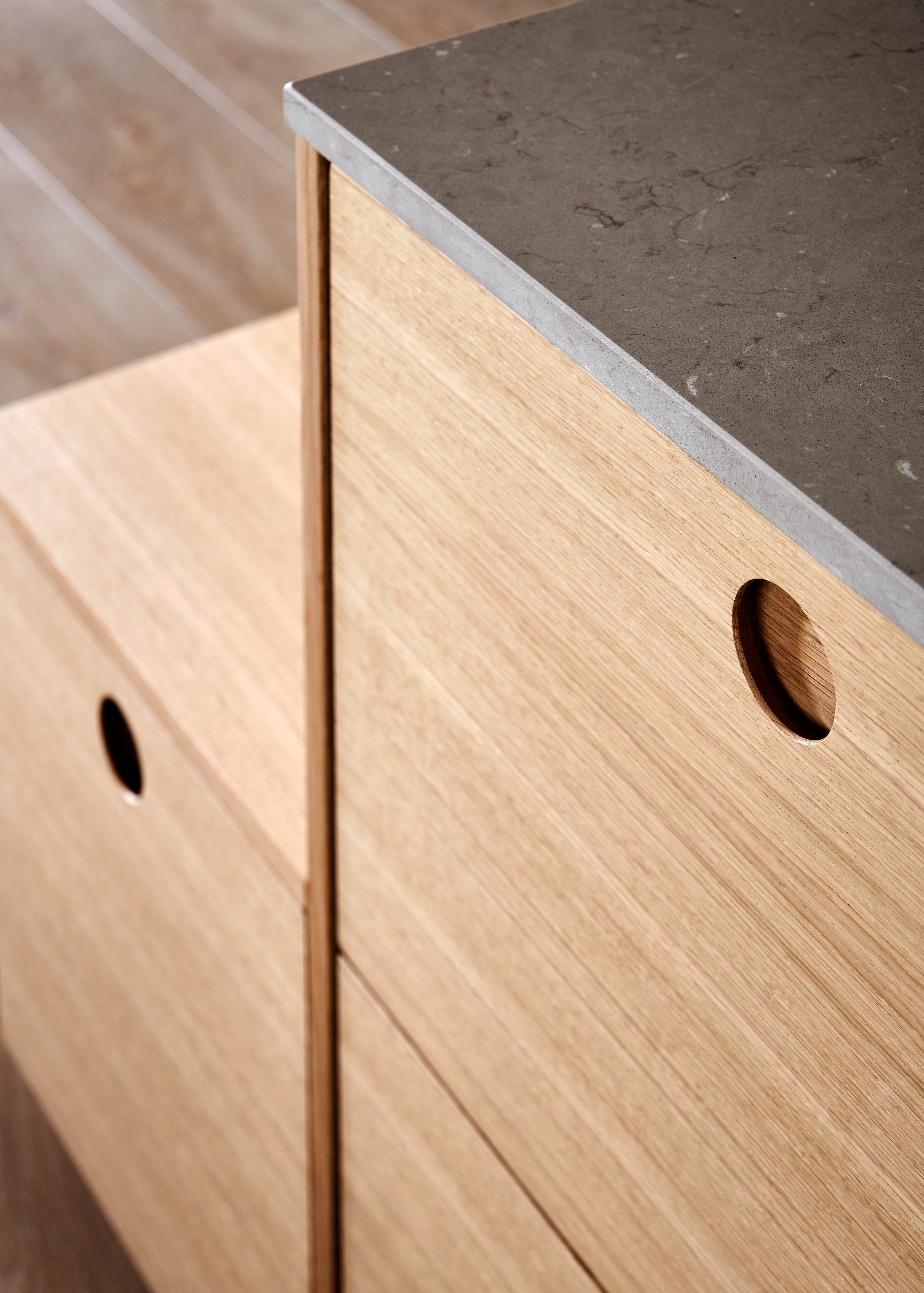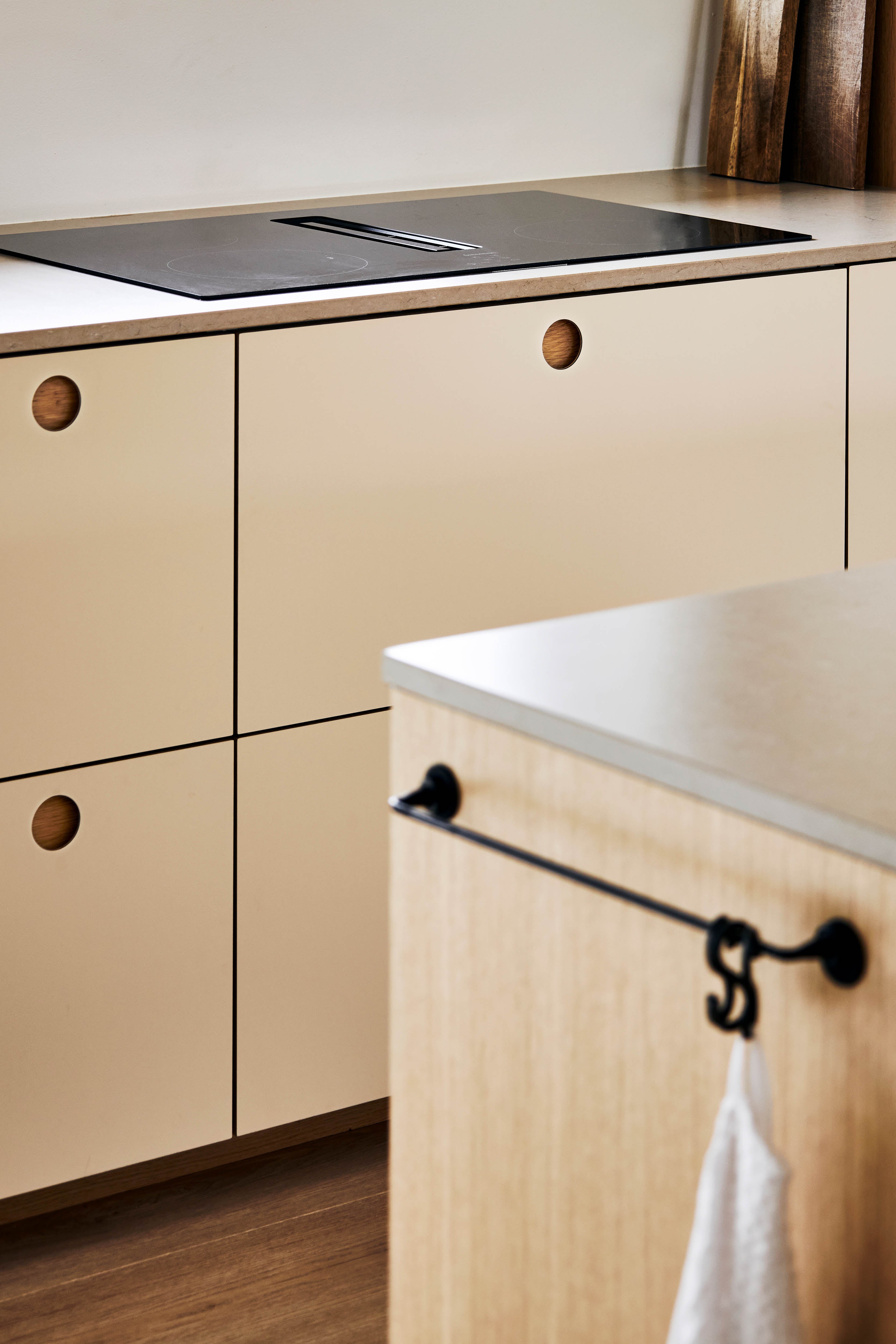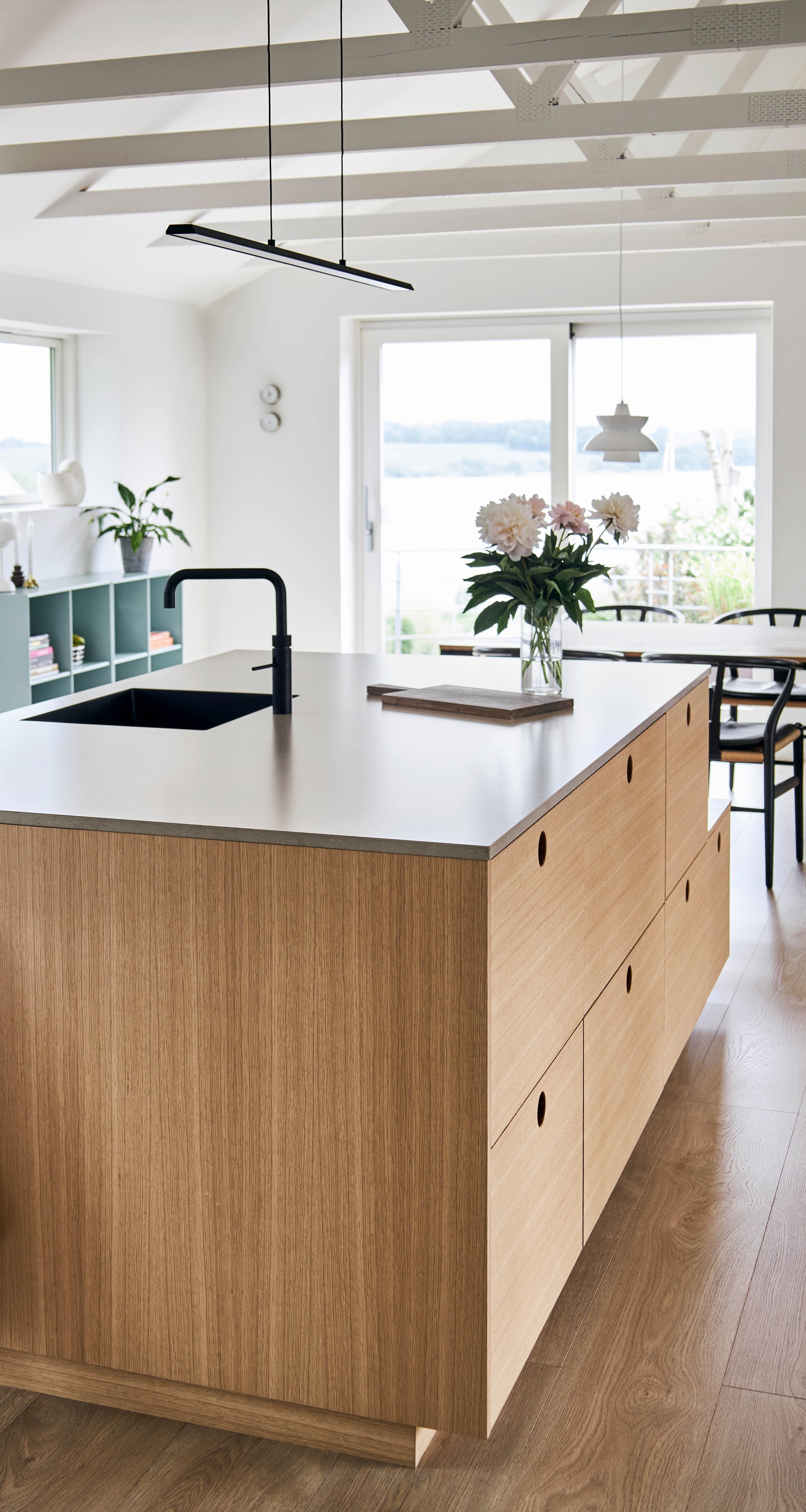 Maja og Jeppe ønskede et køkken i egetræ, men uden at det virkede for traditionelt. Derfor valgte de en kombination af egetræs- og laminatfronter. Efter en omhyggelig overvejelse fandt de den ideelle farve, som ville passe perfekt til deres hjem og stil, både nu og i fremtiden.