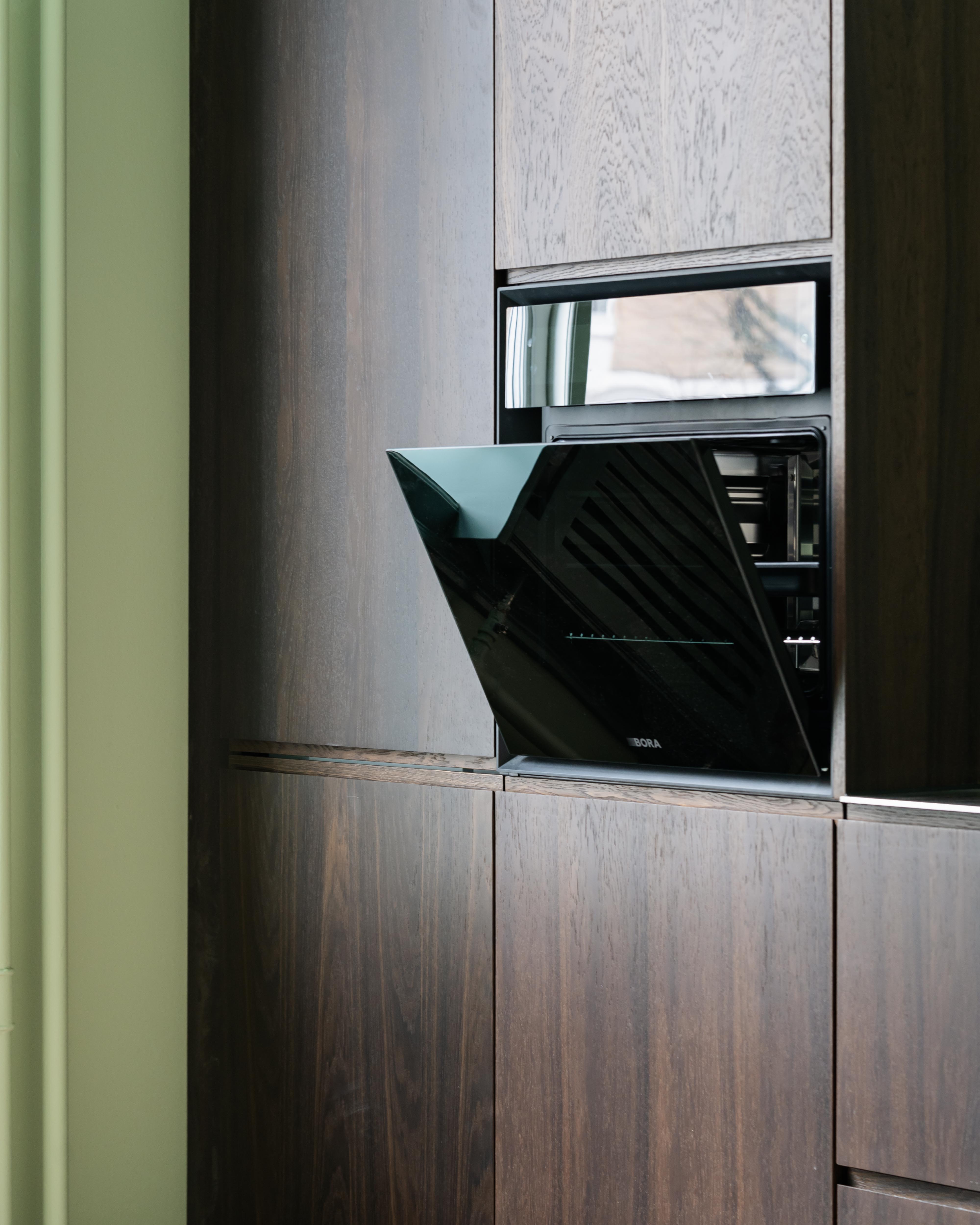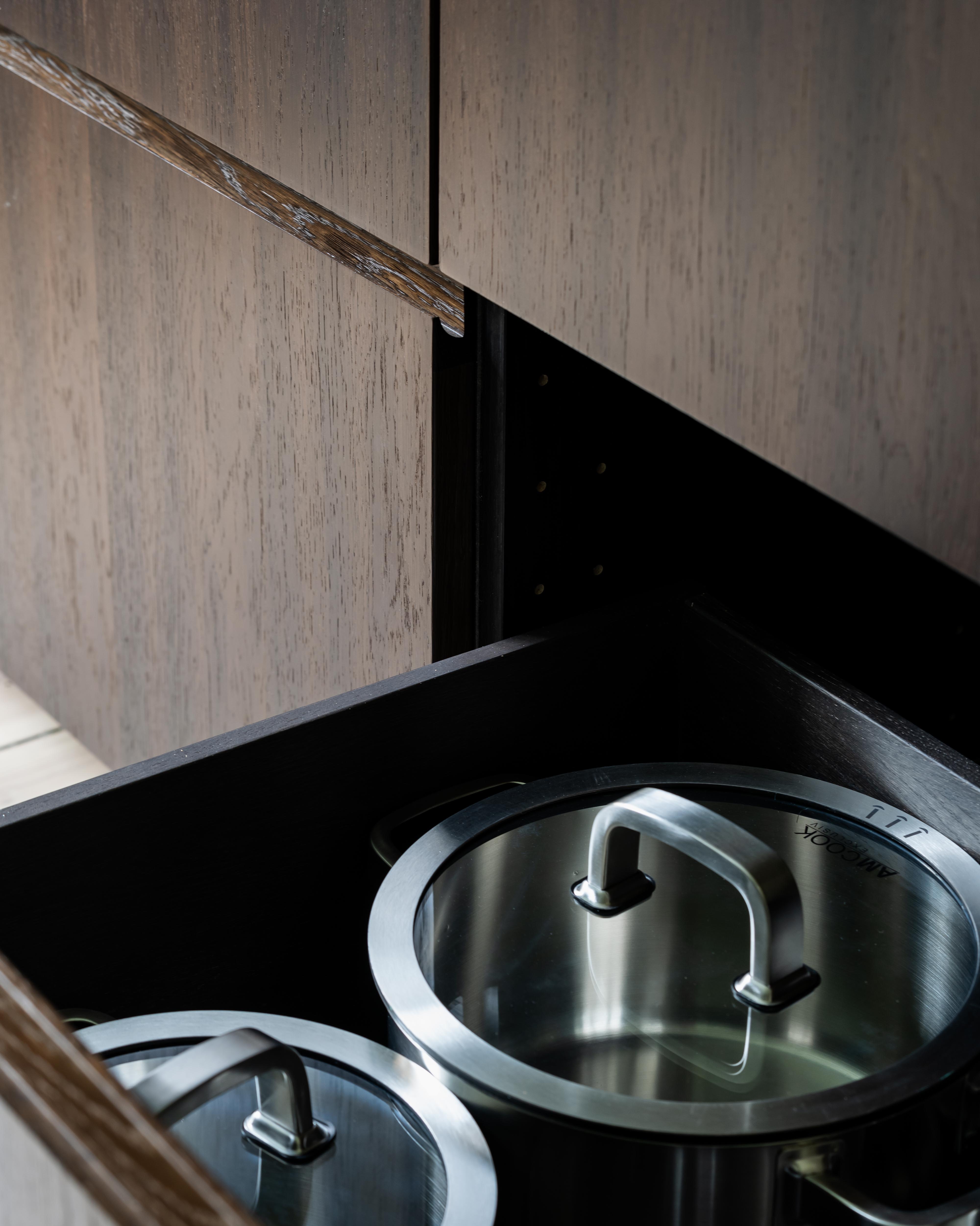 I en lejlighed på Frederiksberg har Jacob skabt et sammenhængende hjem med snedkerløsninger i røget eg. Fra køkken til