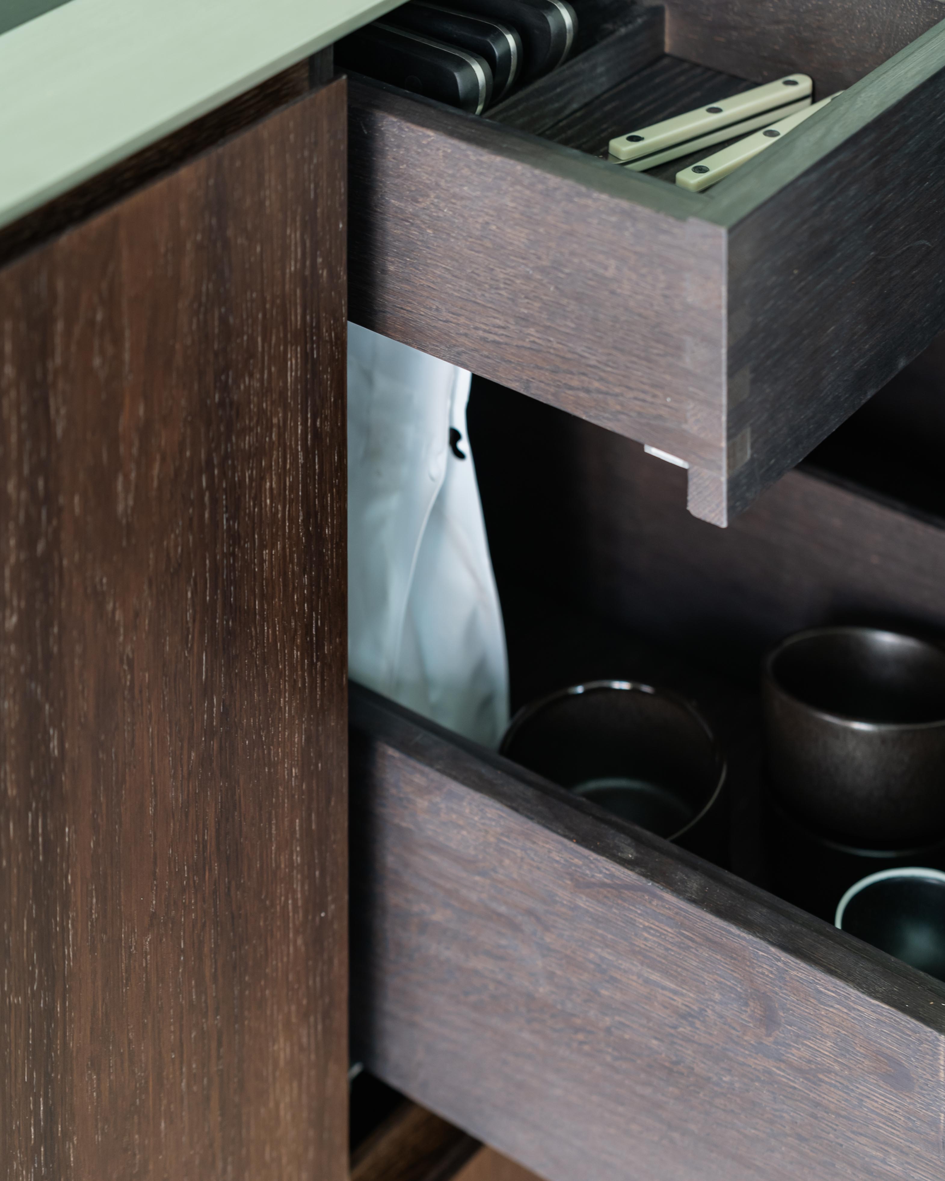 Jacobs krav til køkkenet var klare: Det skulle være eksklusivt, minimalistisk og tidløst. Røget eg blev valgt som det gennemgående materiale, og resultatet er et smukt køkken, der balancerer æstetik og funktion. Endeløsningen, som er en reol, der bruges til glas, er en detalje, Jacob er særligt glad for, ligesom de mørke egetræsfronter og de mørke fingertappede træskuffer.