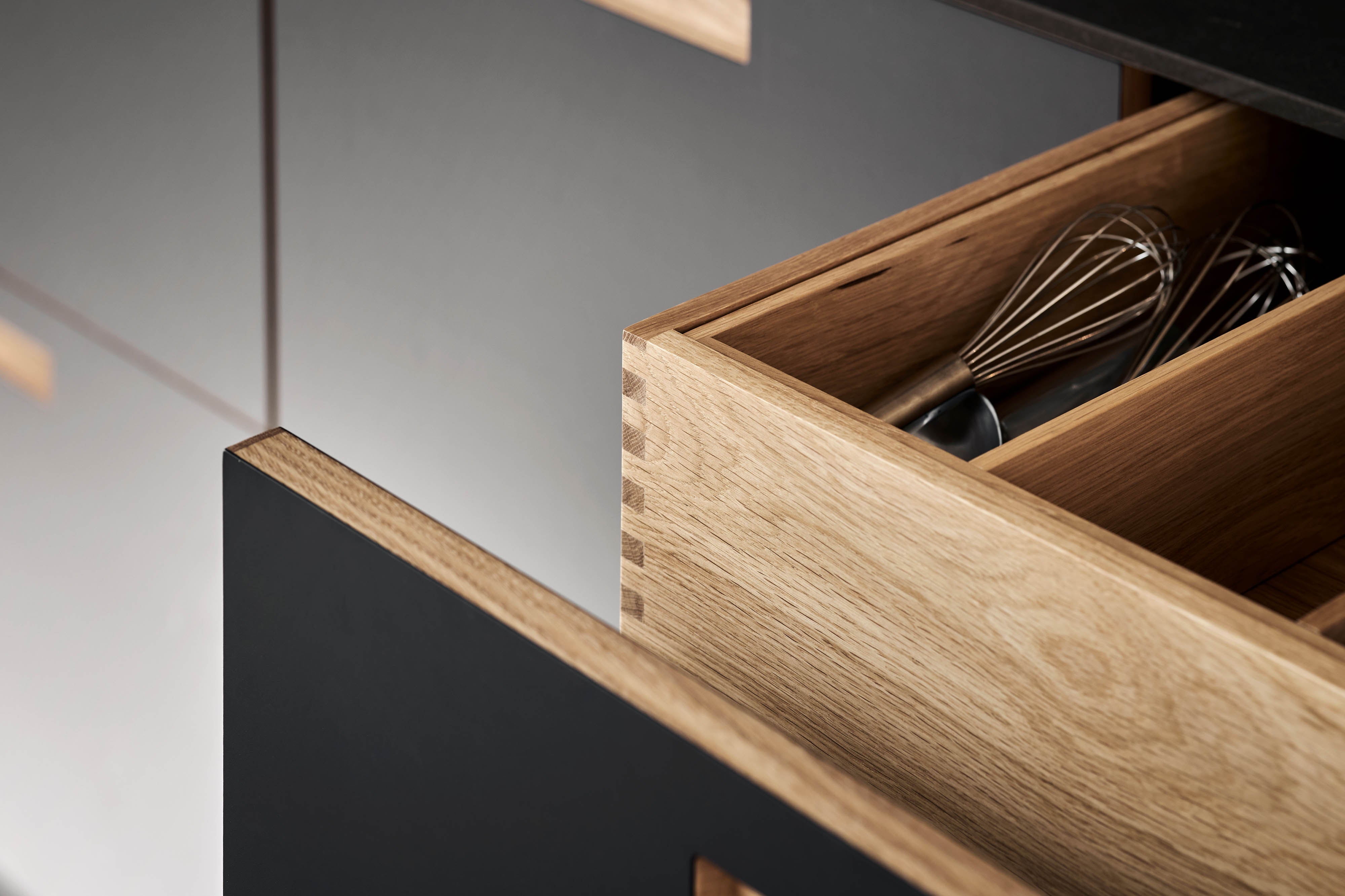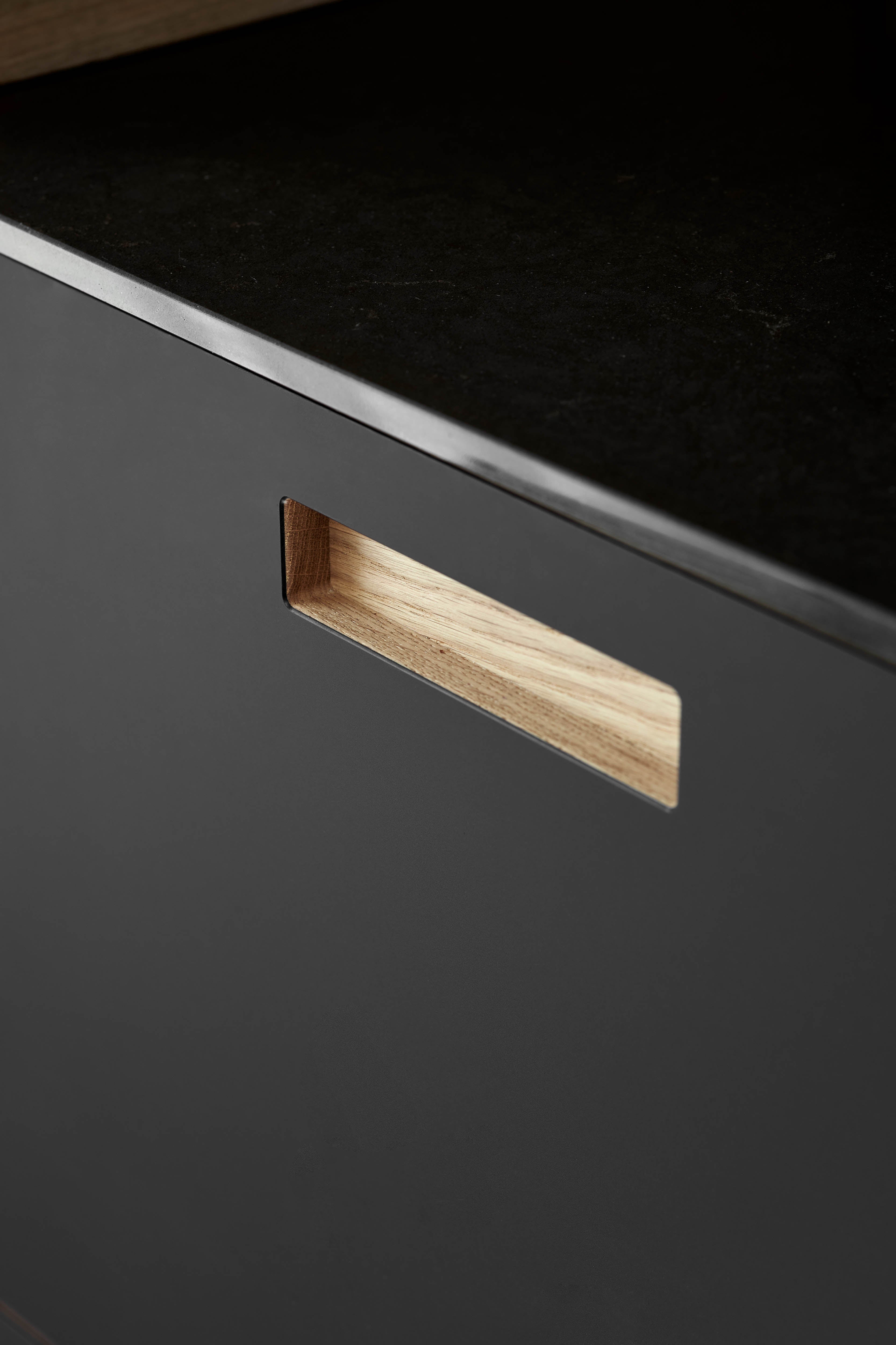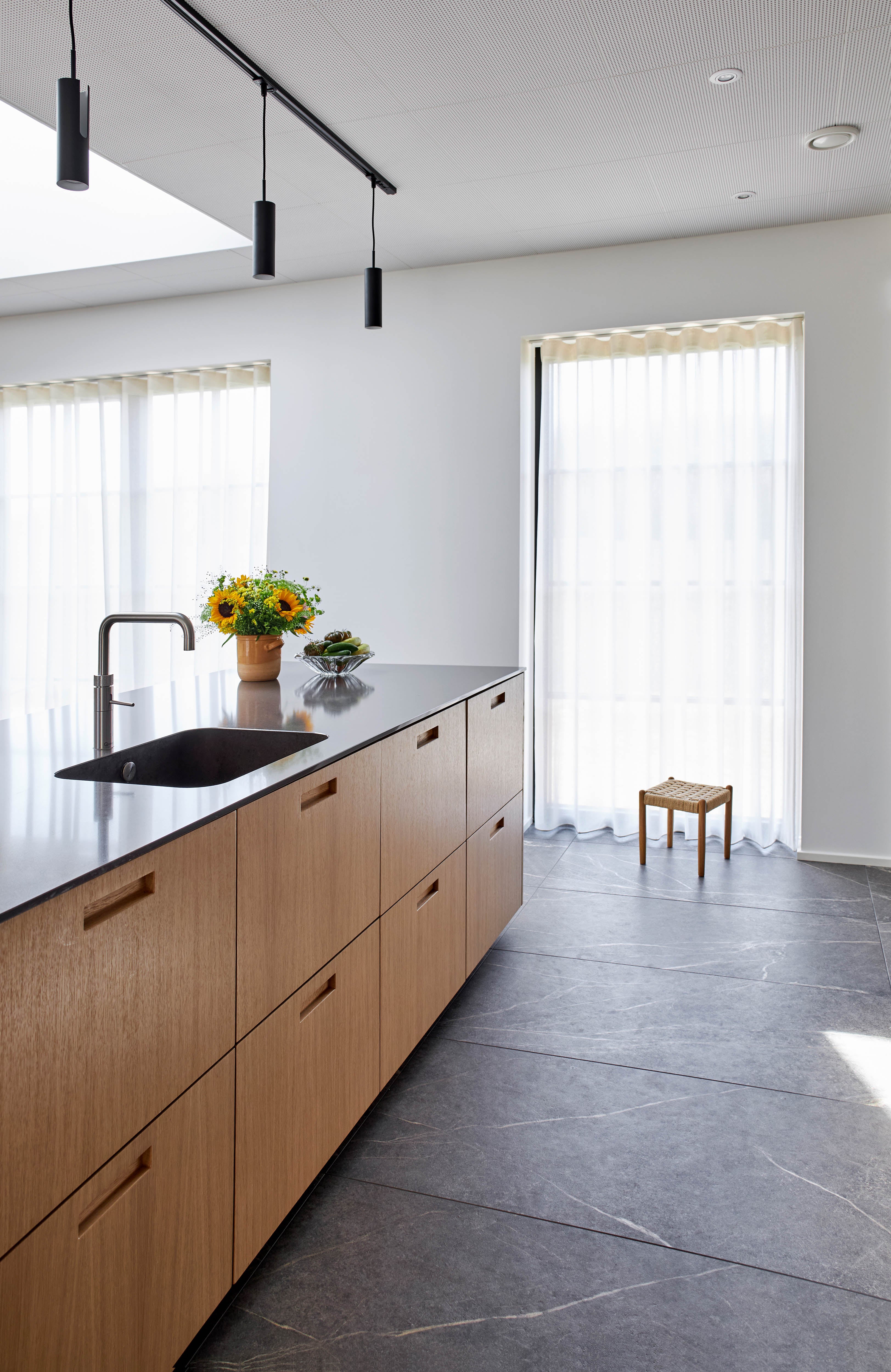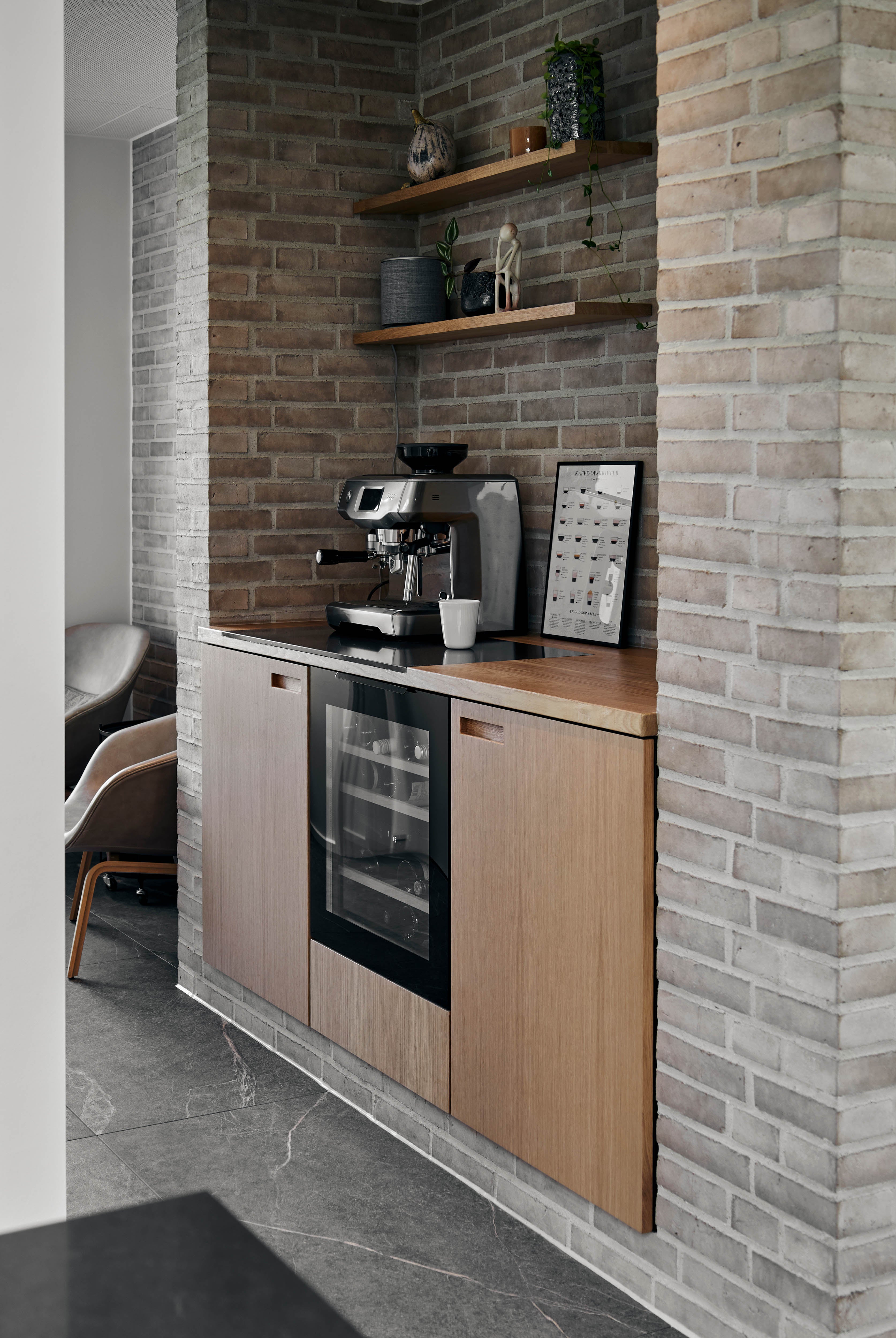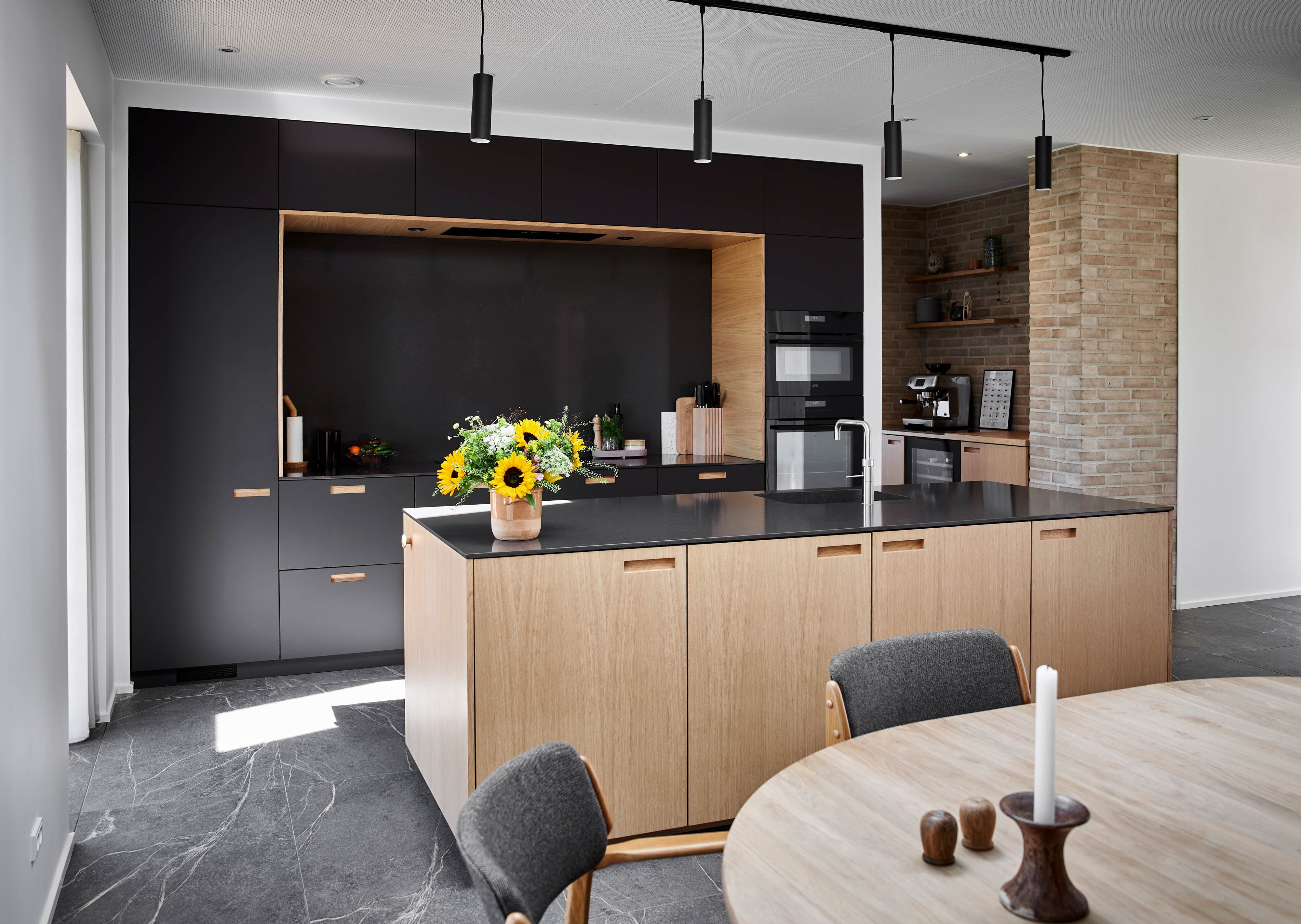 I starten af deres Form Plus-rejse var deres ønske, at snedkerløsningerne skulle udstråle varme og være indbydende. Derfor valgte de det elegante egetræslook og supplerede det med en mørk Fenix laminat, hvilket harmonerer perfekt med deres stil.