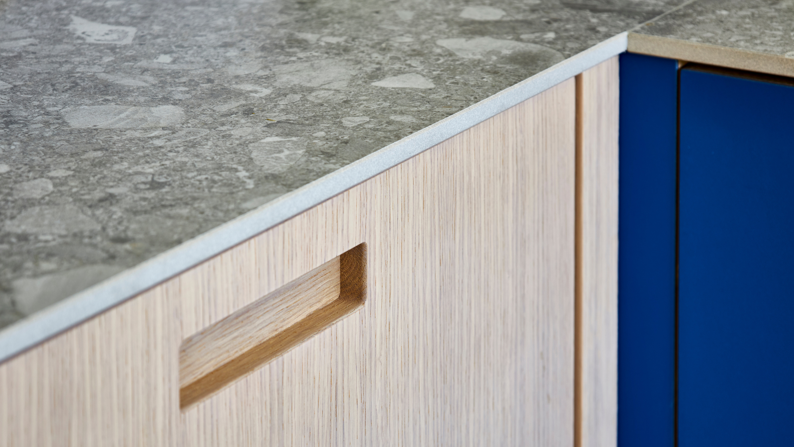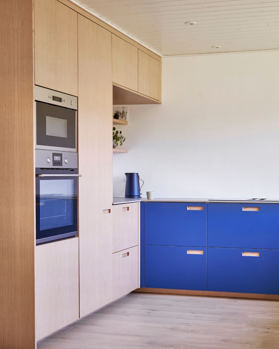 De startede med at finde inspiration på Instagram og forskellige hjemmesider og havde leget med tanken om et blåt køkken. De besøgte vores showroom i Aarhus, for at se vores produkter, og lånte en snedkerkasse med hjem, så de kunne se alle farverne derhjemme i deres eget lys. De blev forelsket i den blå linoleumsfarve, så de kontaktede vores indretningskonsulent Nadja, som lavede nogle forskellige 3D-visualiseringer til dem. Ud fra disse tegninger kunne de se, hvordan den blå farve og den hvide eg ville se ud i deres hjem. Efter nogle forskellige visualiseringer, fandt de frem til den helt rigtige kombination mellem den hvide eg og det blå linoleum.