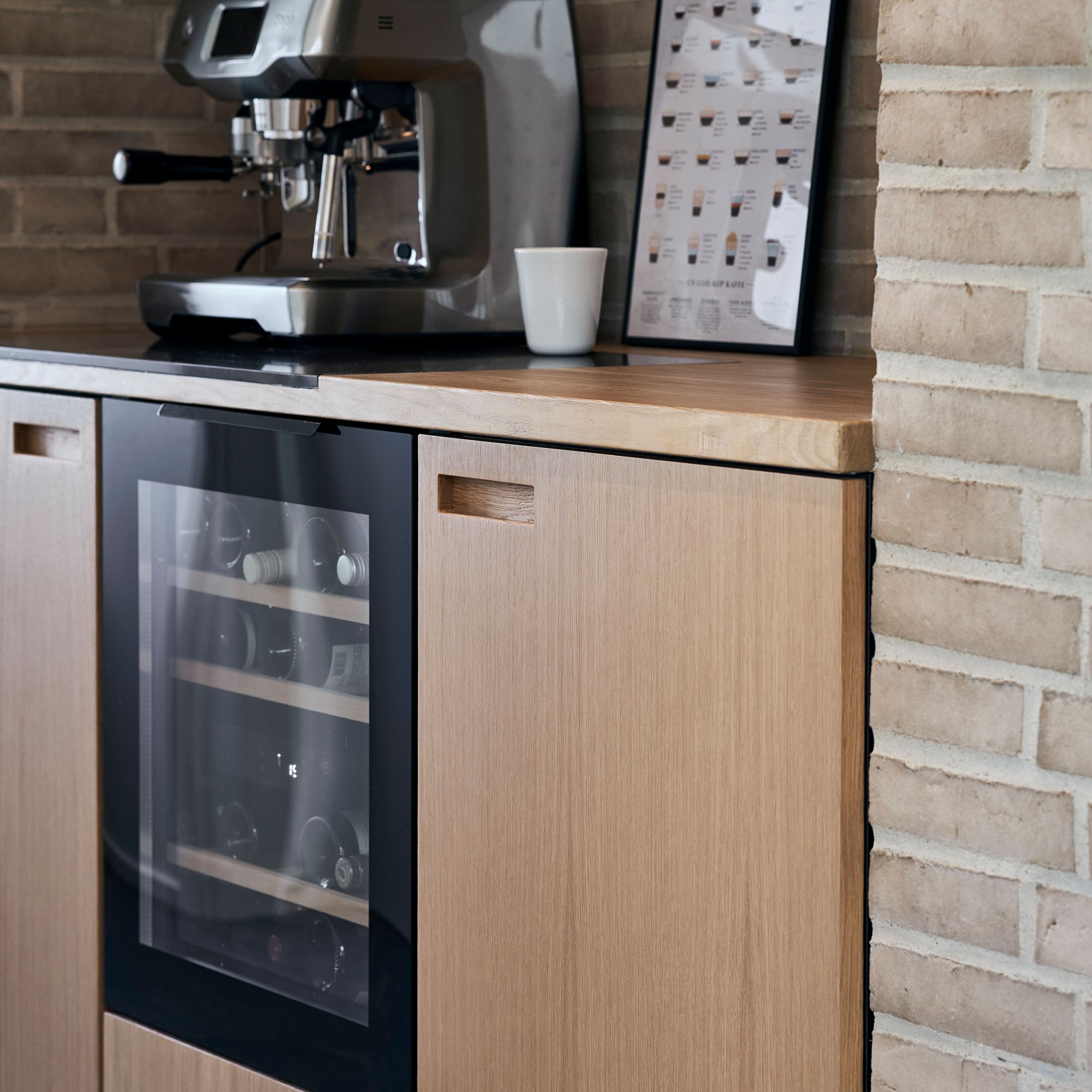 - Træets nuancer og åretegninger passer sammen på tværs af modulerne i køkkenet.