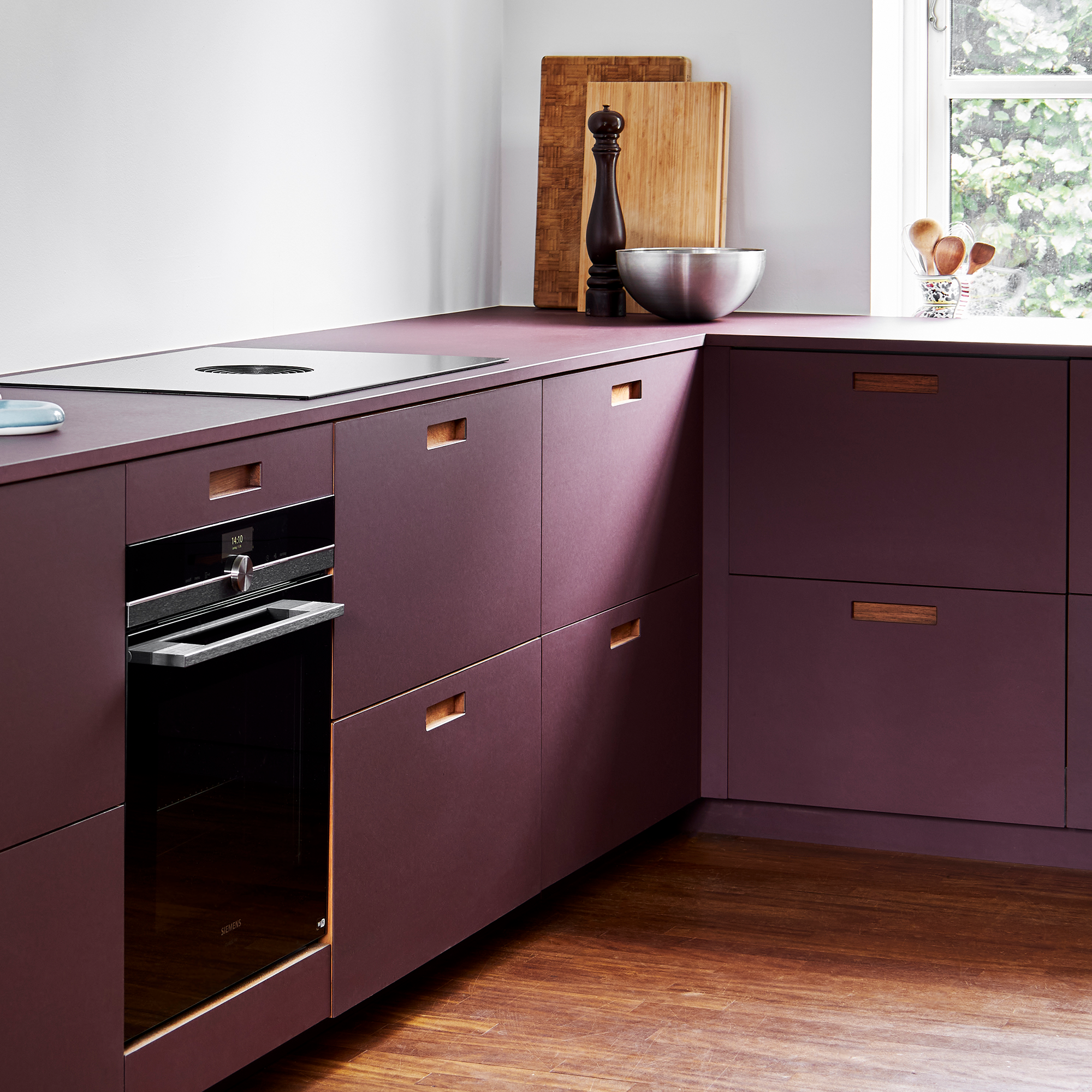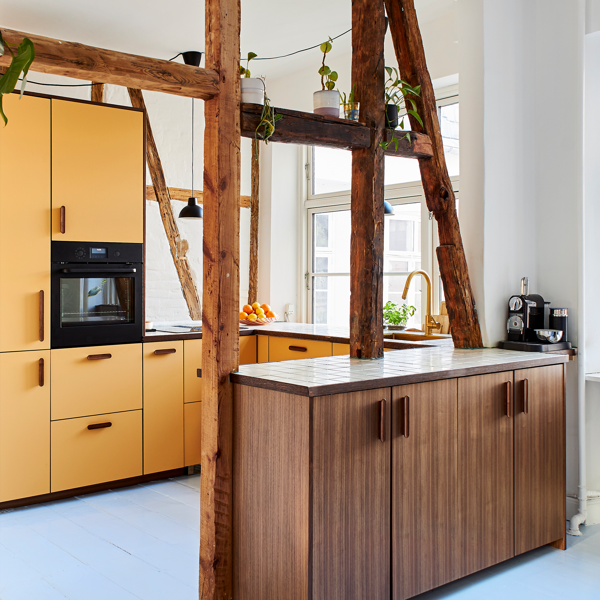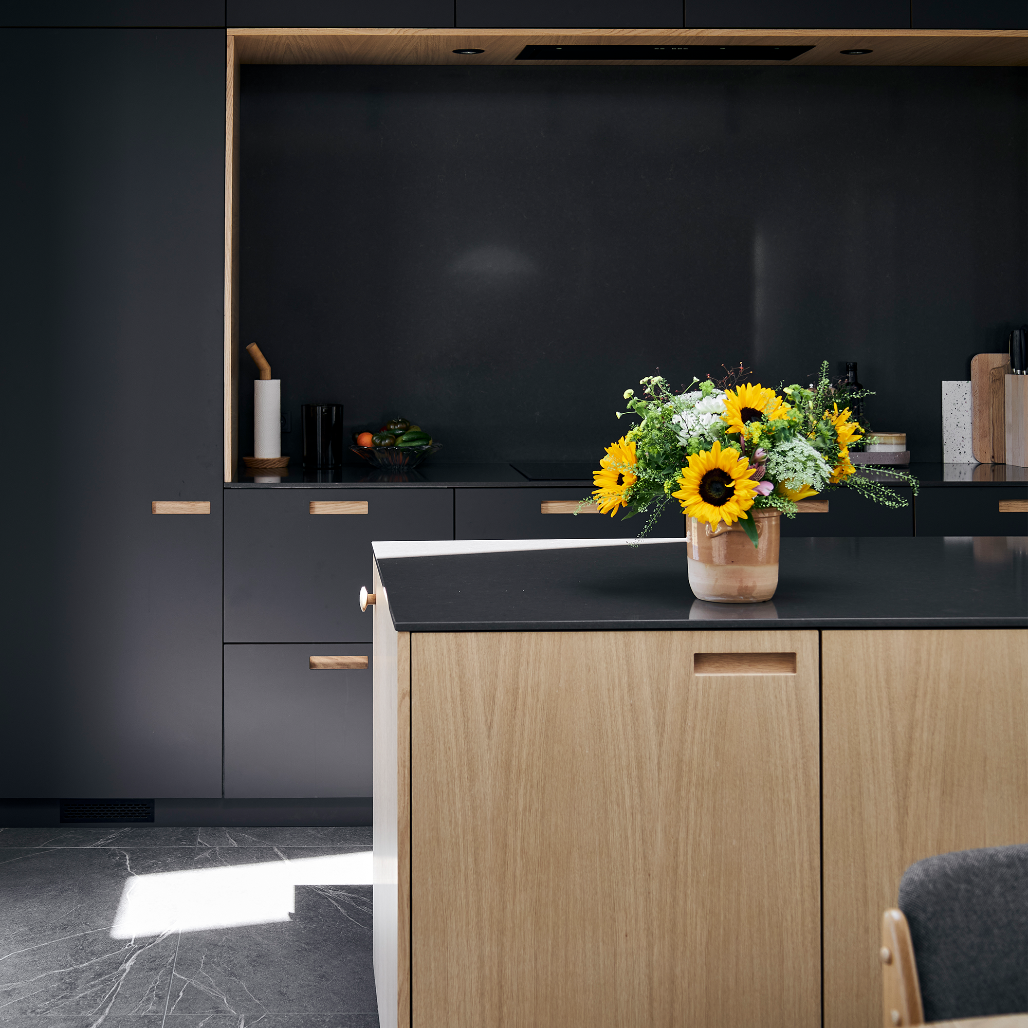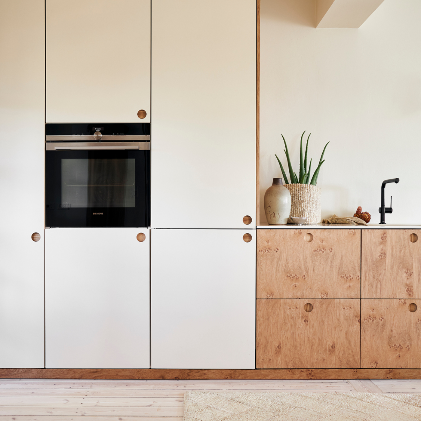 - Træets nuancer og åretegninger passer sammen på tværs af modulerne i køkkenet.