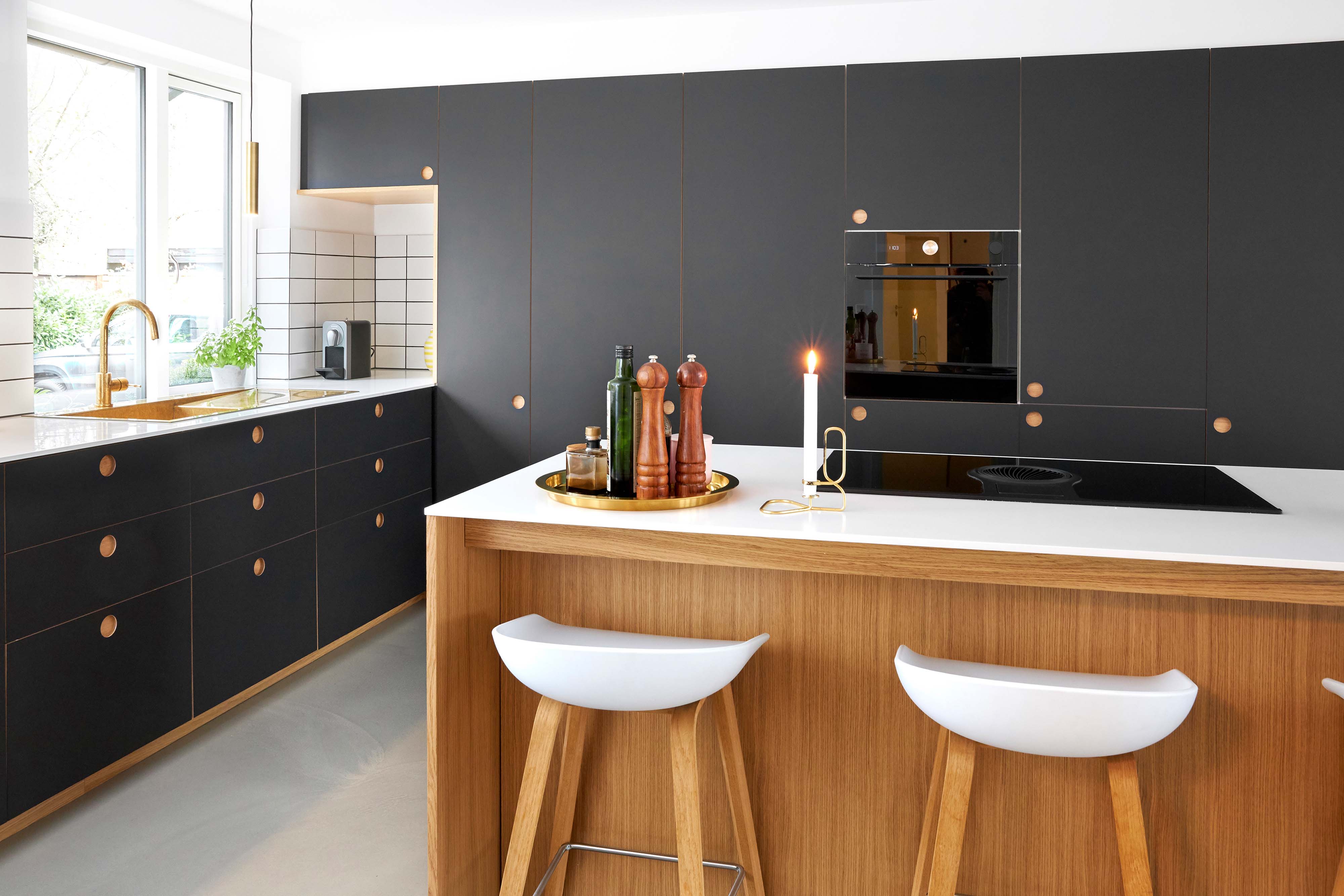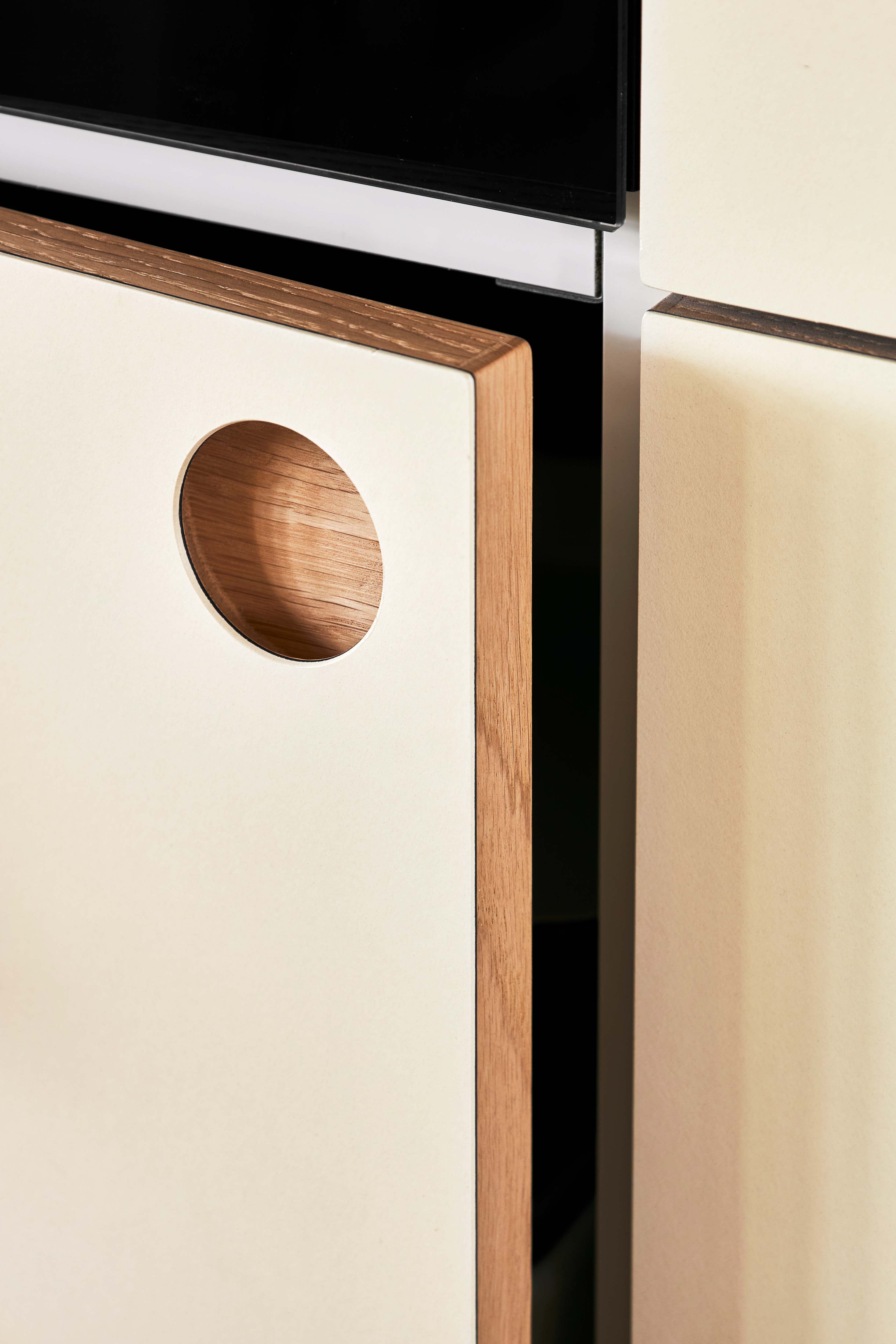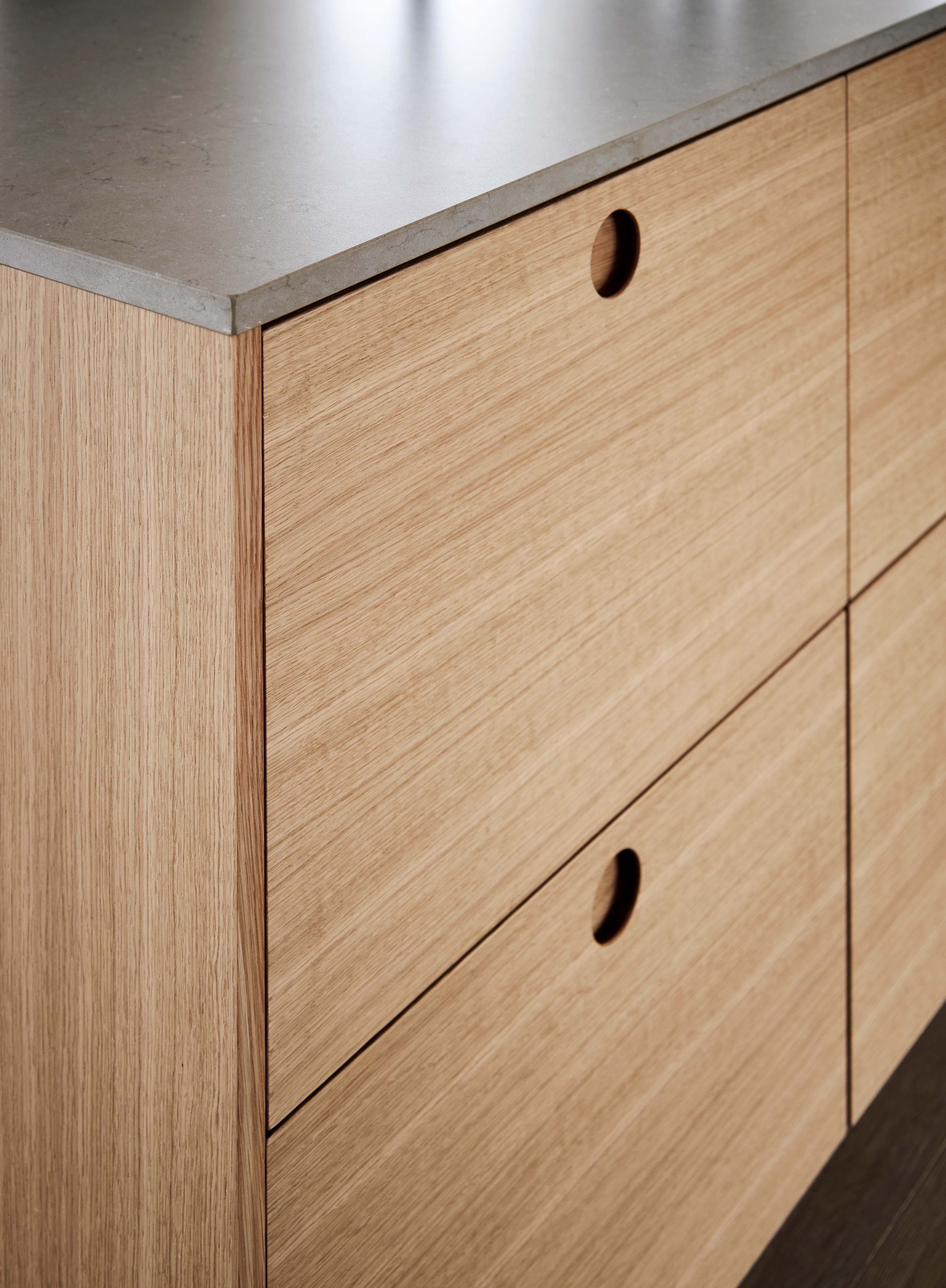 Her er vores moderne fortolkning af en retro låge, der passer godt ind i det moderne- og stilbevidste hjem. Lågen består af kanter i massiv træ og med en overflade i håndsorteret træfinér, fenix laminat eller linoleum. Snedkerdetaljen er det runde indfræsede greb i massiv træ, der sammen med den glatte bagside af håndsorteret træfinér fremhæver en detaljegrad, som kun de mest eksklusive køkkenfronter og -låger har.