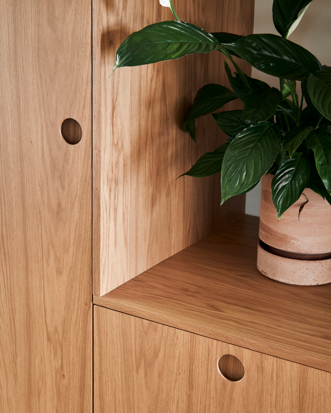 Snedkerfront med ifræset rundt greb i massivt træ og massiv trækant.
