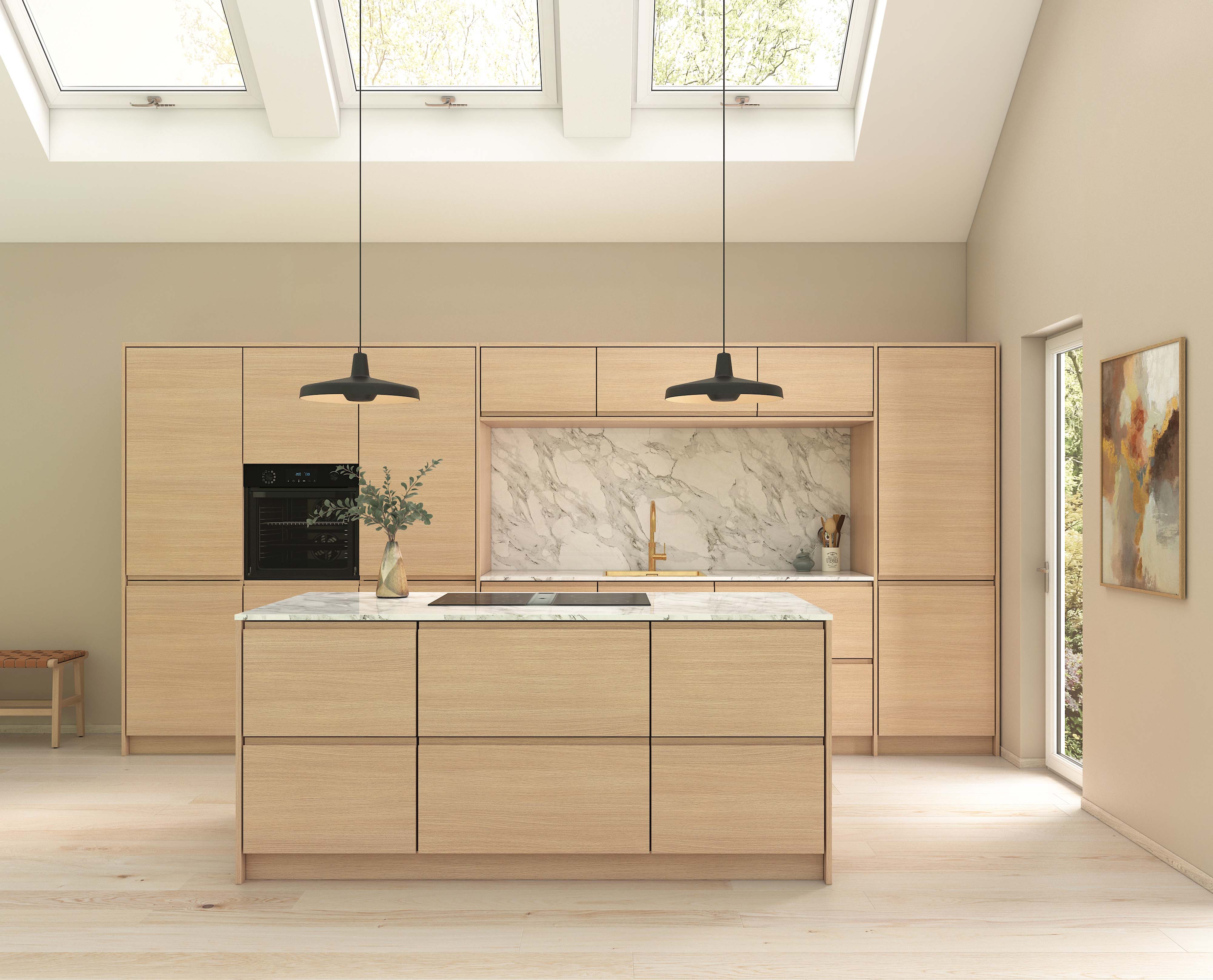 Vores grebsfrie køkkenlåge får med det fineste håndsorterede træfinér, linoleum eller fenix laminat, det massive træ til at fremstå rent og eksklusivt. Snedkerdetaljen er de flotte vandrette linjer, der står stilrene og skarpe gennem hele køkkenet – også selvom det er over opvaskemaskinen.