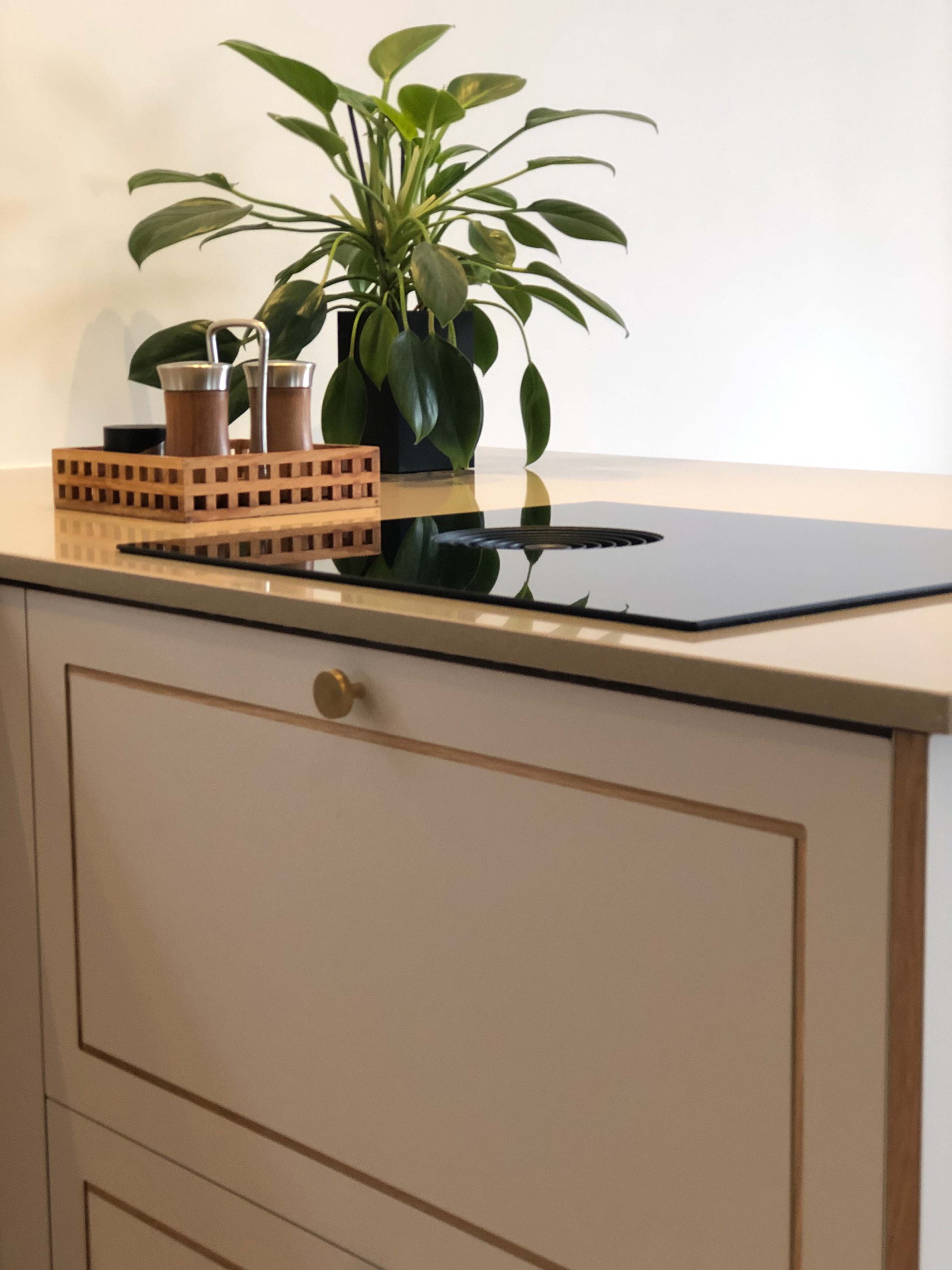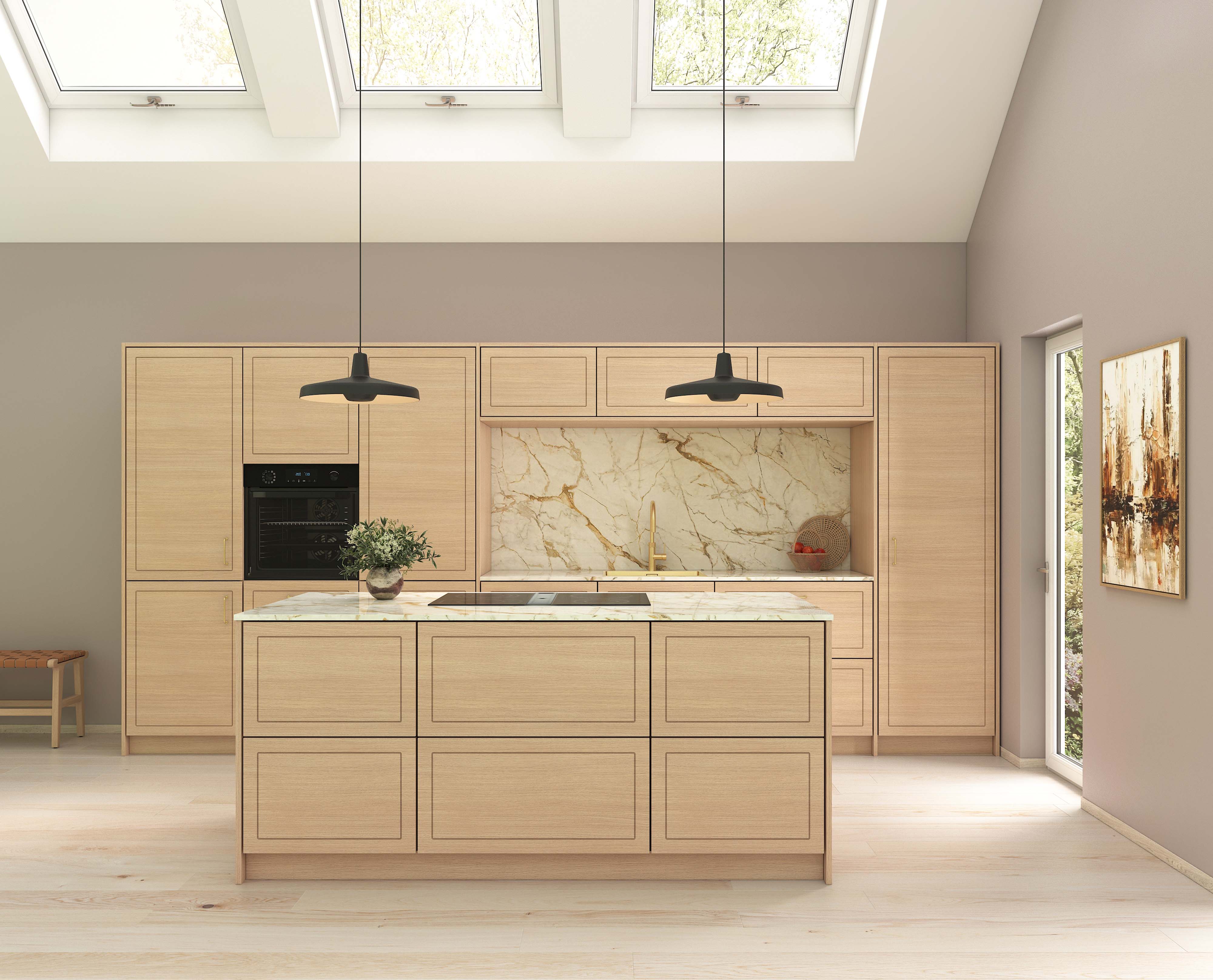 Her er vores moderne fortolkning af en klassisk shakerlåge, der bringer et strejf af tidløs elegance ind i ethvert moderne hjem. Denne front kombinerer nøje udvalgt massivt træ med en ramme, der tilføjer et lækkert element af dybde og dimension til dit køkken. Uanset om du foretrækker en naturlig finish med træfinér eller en mere farverig overflade med fenix laminat eller linoleum, kan du få fronten som du ønsker. Derudover kan du vælge at få fronten med push funktion, eller om der skal være et greb på.